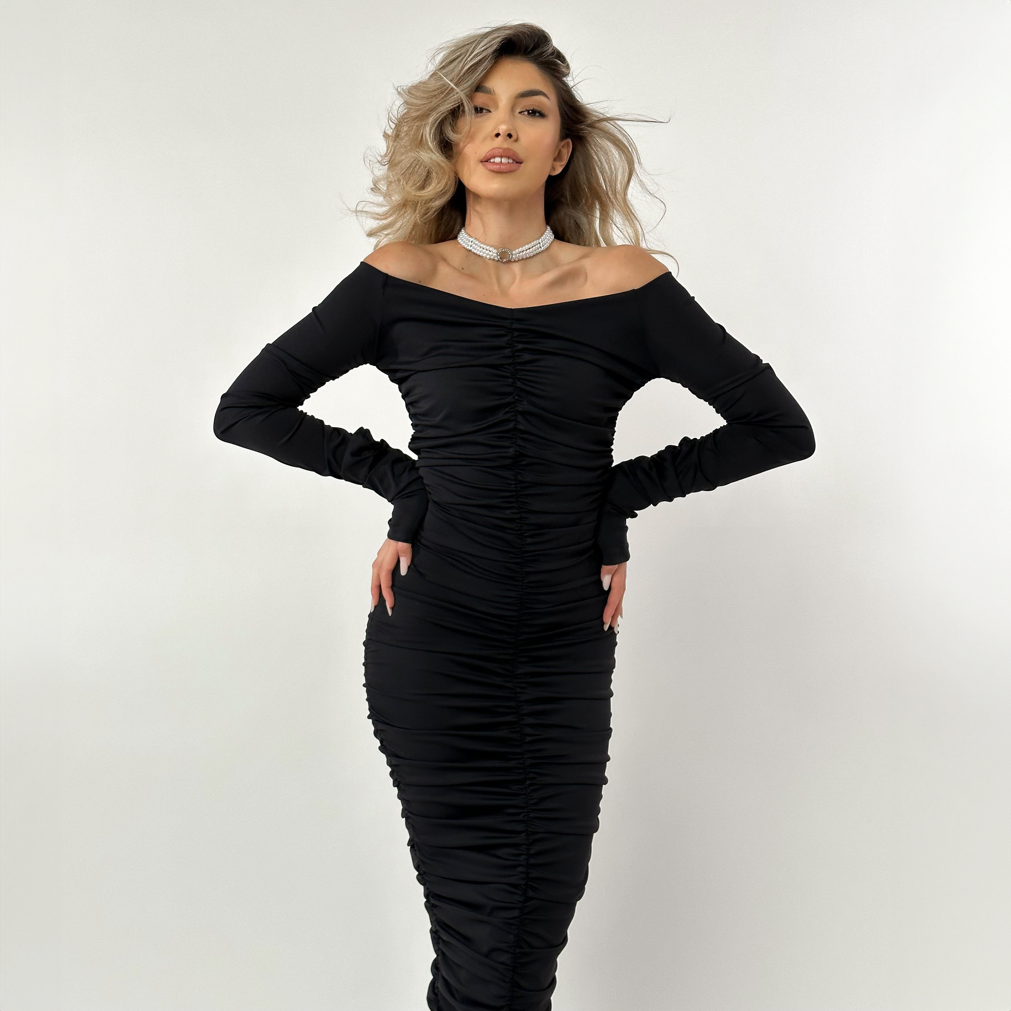 • ATENTIE: lungimea rochiei este medie (acopera genunchii), dar datorita pliurilor, ea poate ajunge si lunga (pana la gambe);