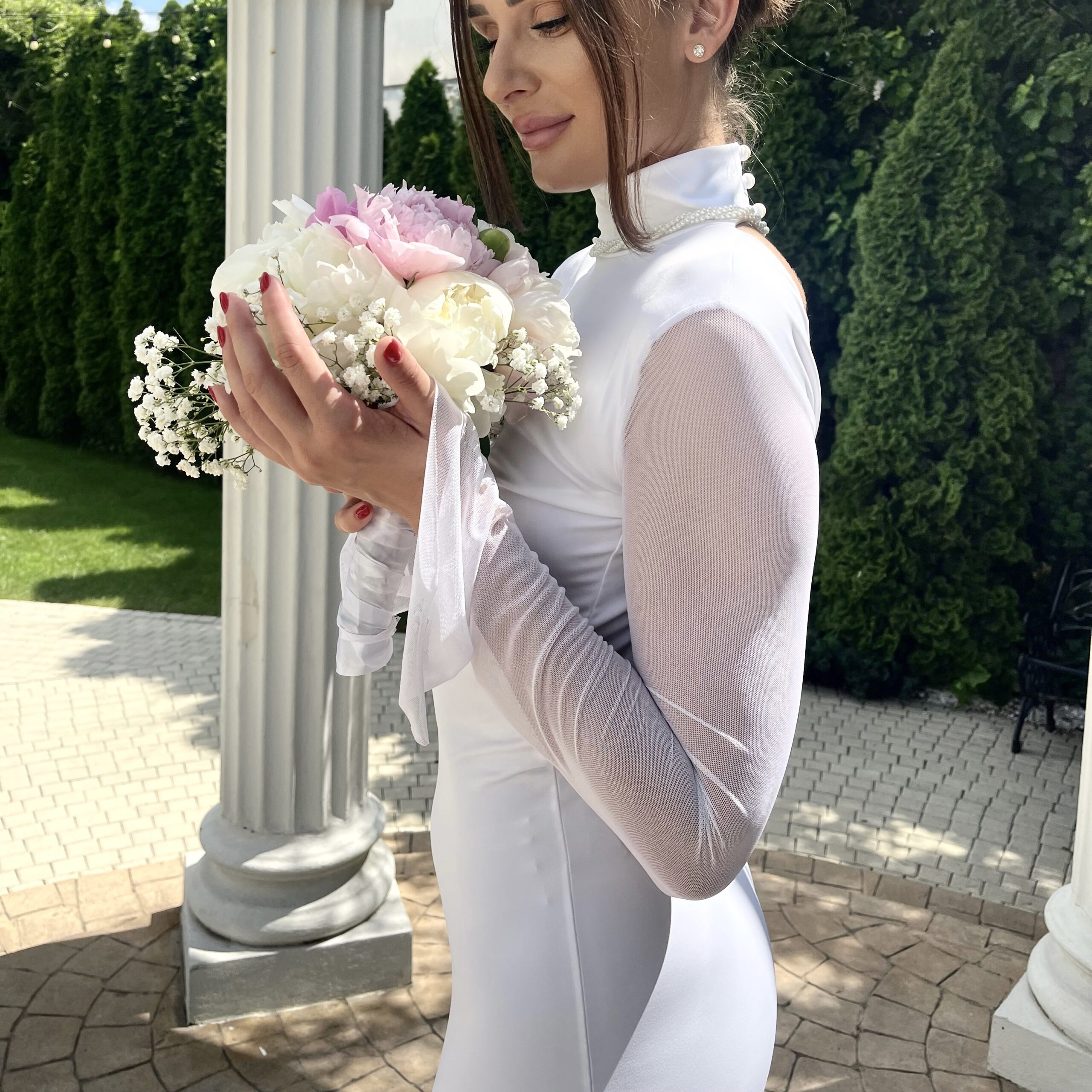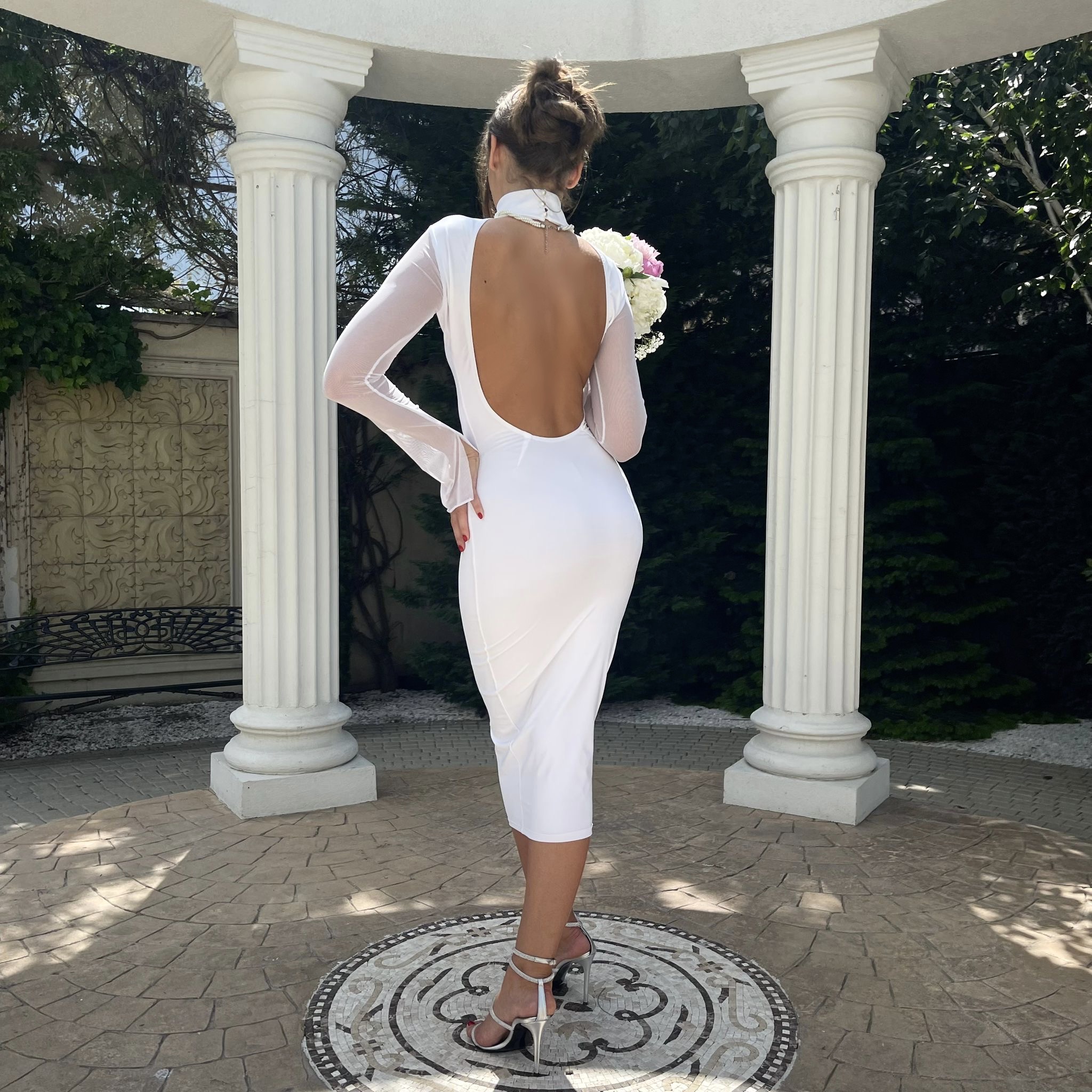 Rochie Cununie Civila Midi Cu Spatele Gol Alba Lycra - Polina
